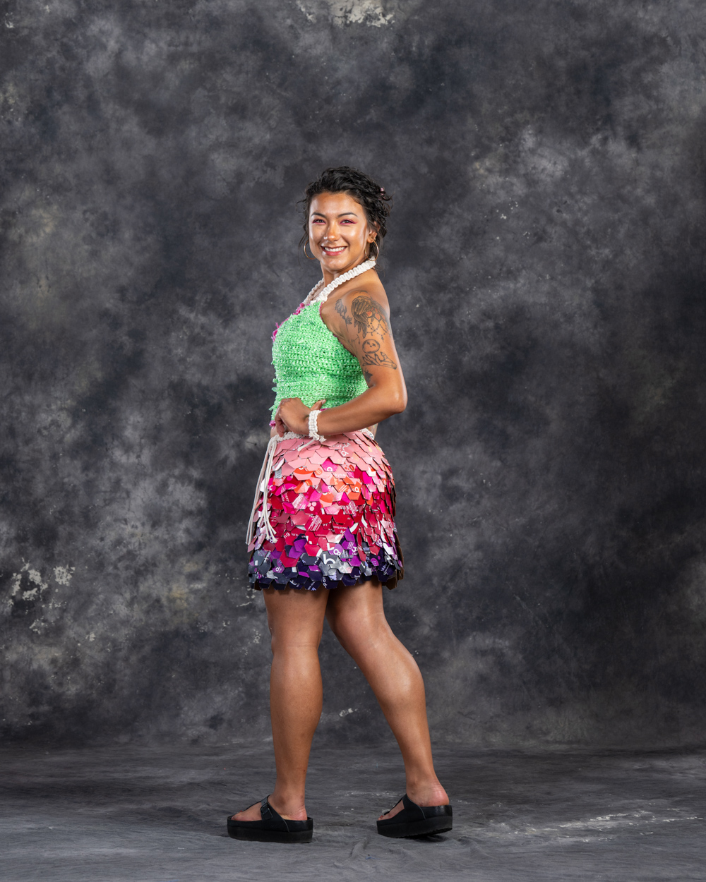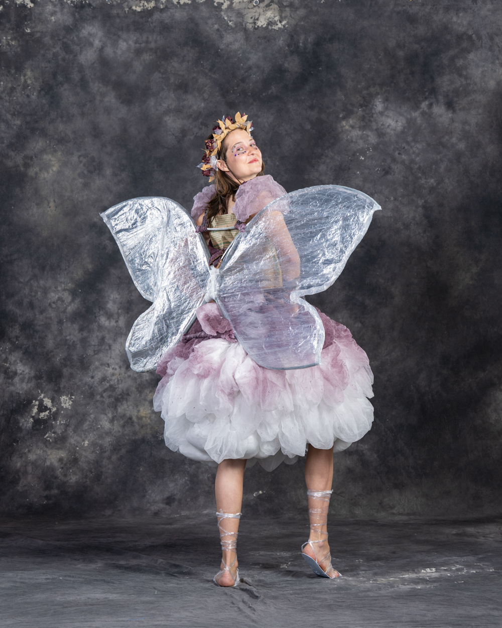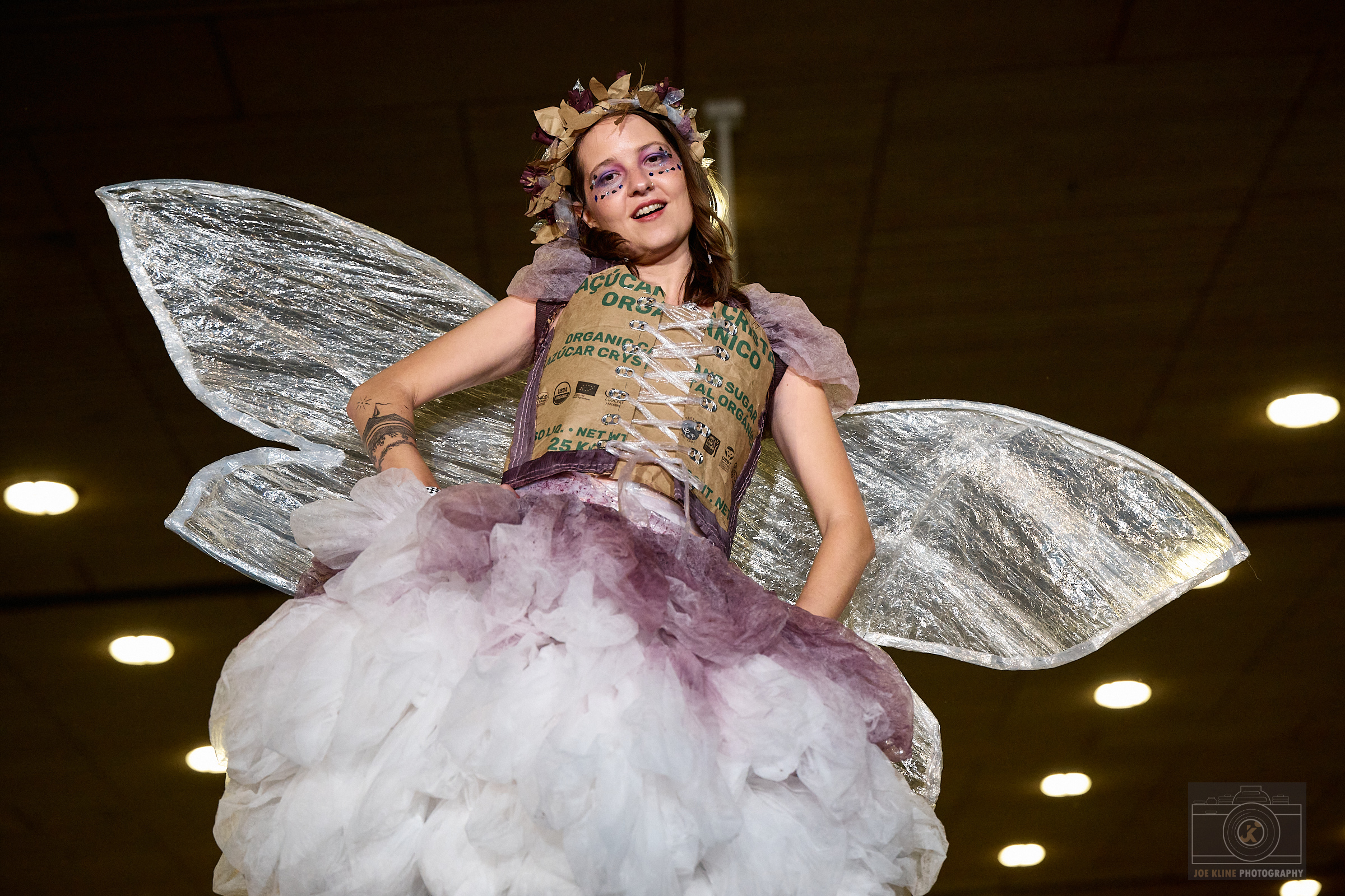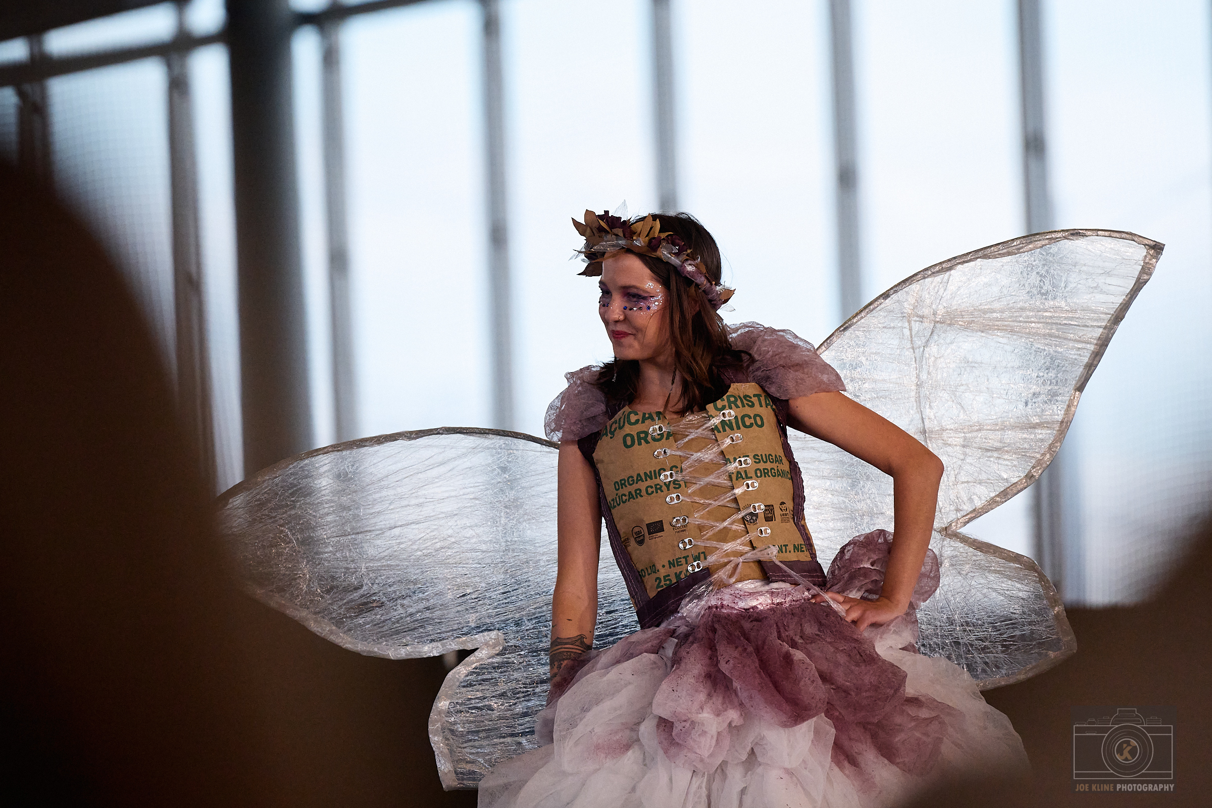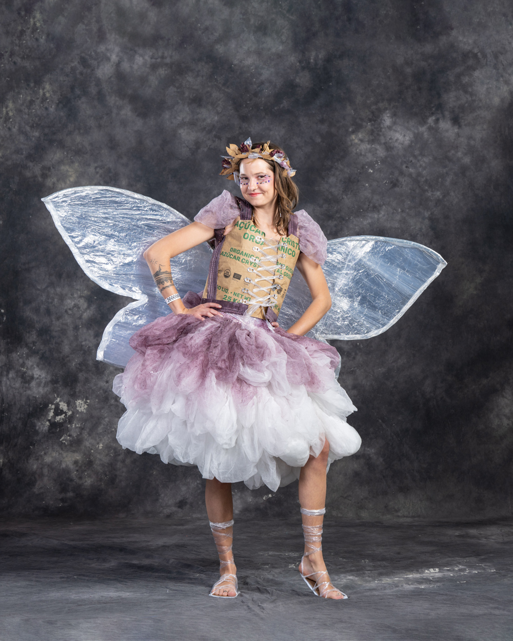 Designers: Zhenya Cotita, Kevin Coneys, Syd Becker Model: Zhenya Cotita Materials: Used hairnets, sugar bags, used plastic wrap, an assortment of materials such as bottle caps, can tabs, bucket lids Garment Description: Inspired by folktales of Fairies, and their deep and abiding connection to the natural world this garment has been constructed using 99% industrial trash from the Humm factory. We hope to inspire further imagination in what is possible using industrial waste, and may we learn from the fairies that a relationship and care for the earth is not just possible, but filled with magic. Sustainable Practices: Use of cans: In the US, aluminum is recycled more often than glass or plastic. Unlike plastic that degrades over time, aluminum can be infinitely recycled. Cans also cost less to ship, both in dollars and in carbon emissions. At Humm, since having produced kombucha in cans, we have taken over 380 trucks off the road over 3 years. Humm is on a path to become B Corp certified. The B Corp Mission is: Make Business a Force for Good. B Lab is the nonprofit network transforming the global economy to benefit all people, communities, and the planet.