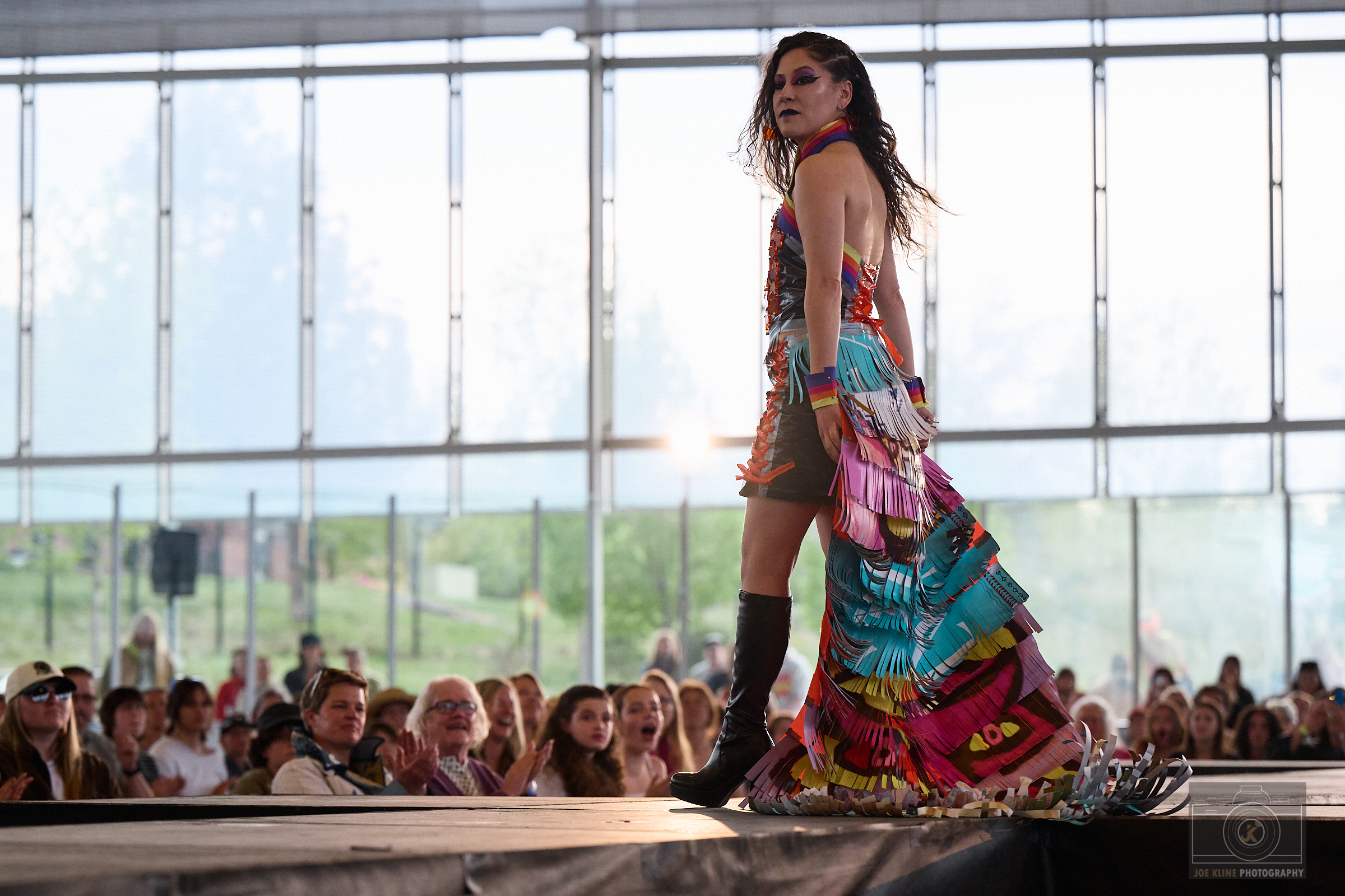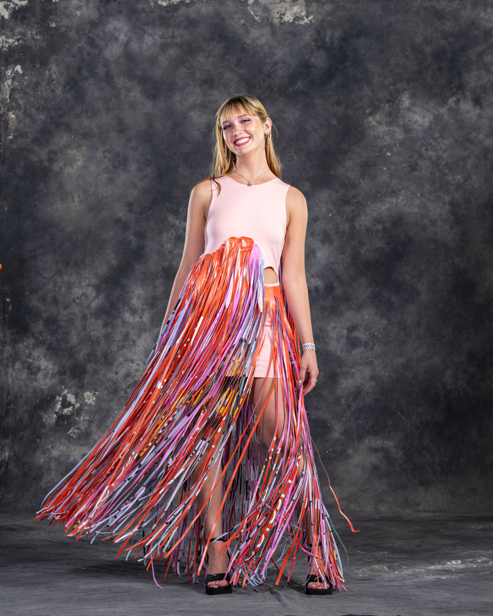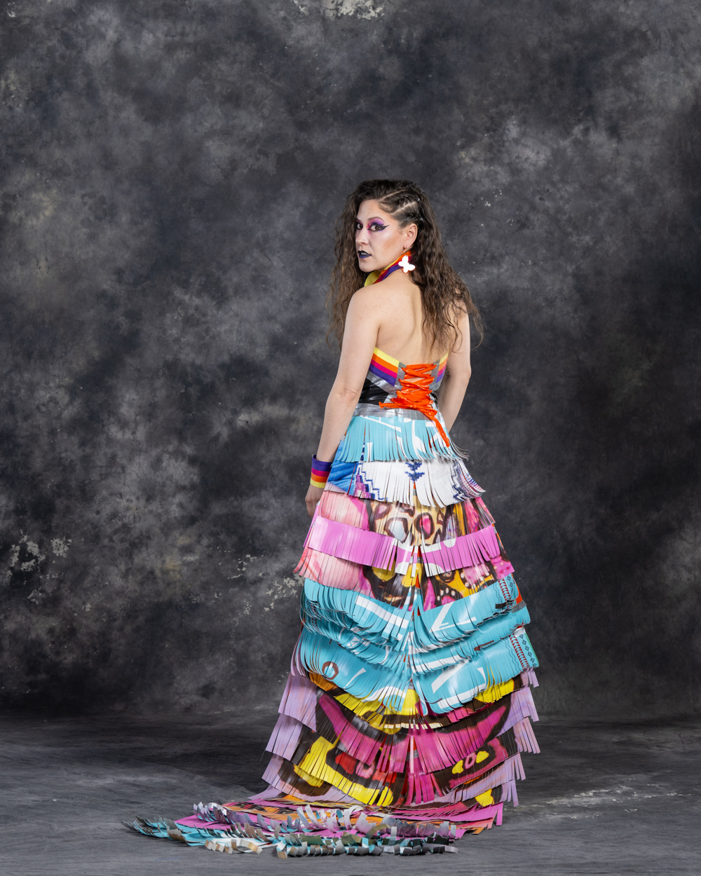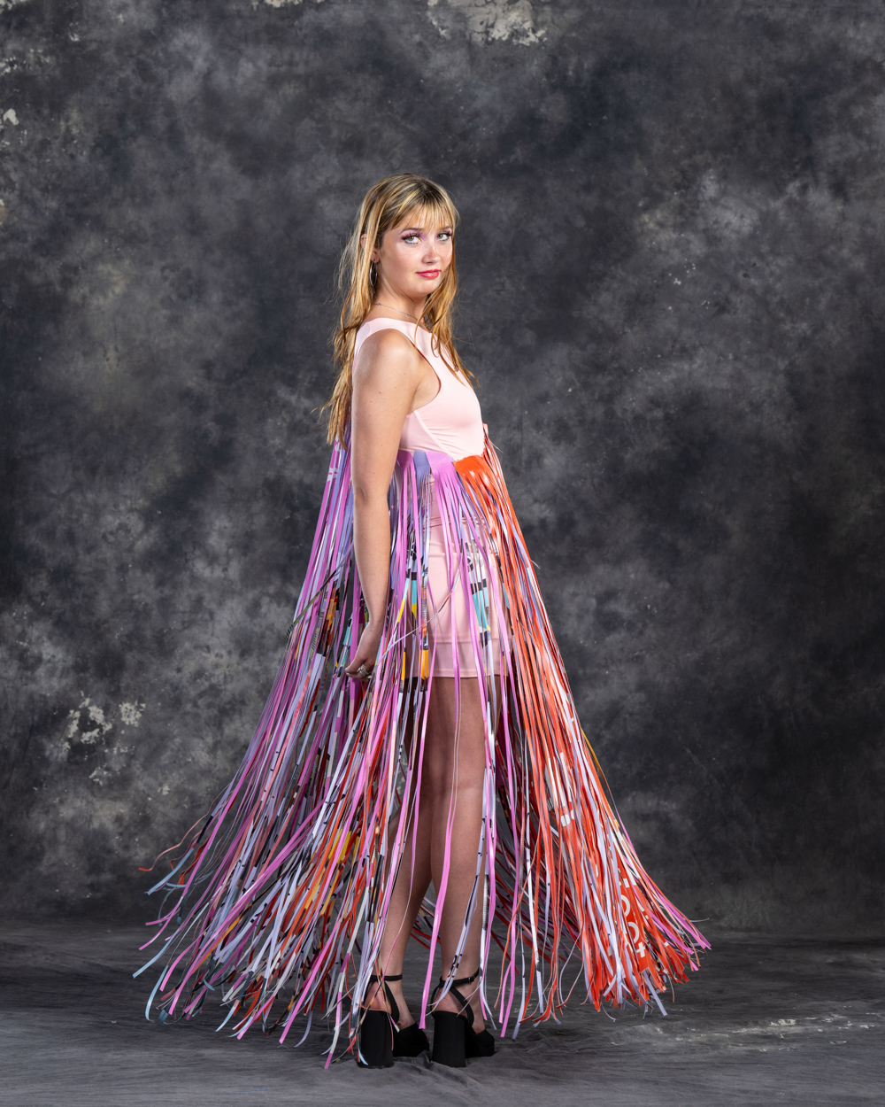 Designers: Nicole Potter Model: Bella Powers Materials: Plastic marketing signs and up cycled/discarded clothes and garment items Garment Description: Even without voices of their own, clothes can say so much. Instead of chanting “new new new” and “more more more,” let them scream that Old is the New Black! United on the right side of history, we’re all making it today with creativity, joy, and sustainable revolution because actually, we really DO care! I believe that art and fashion are windows and mirrors into our society and this moment inspires me to make my message louder. This garment has a lot to say about consumerism, power, and how we can all do more even simply by what we choose to dress in each day. Sustainable Practices: We divert, upcycle, and connect waste destined for the landfill to those who need, want, or use the waste.