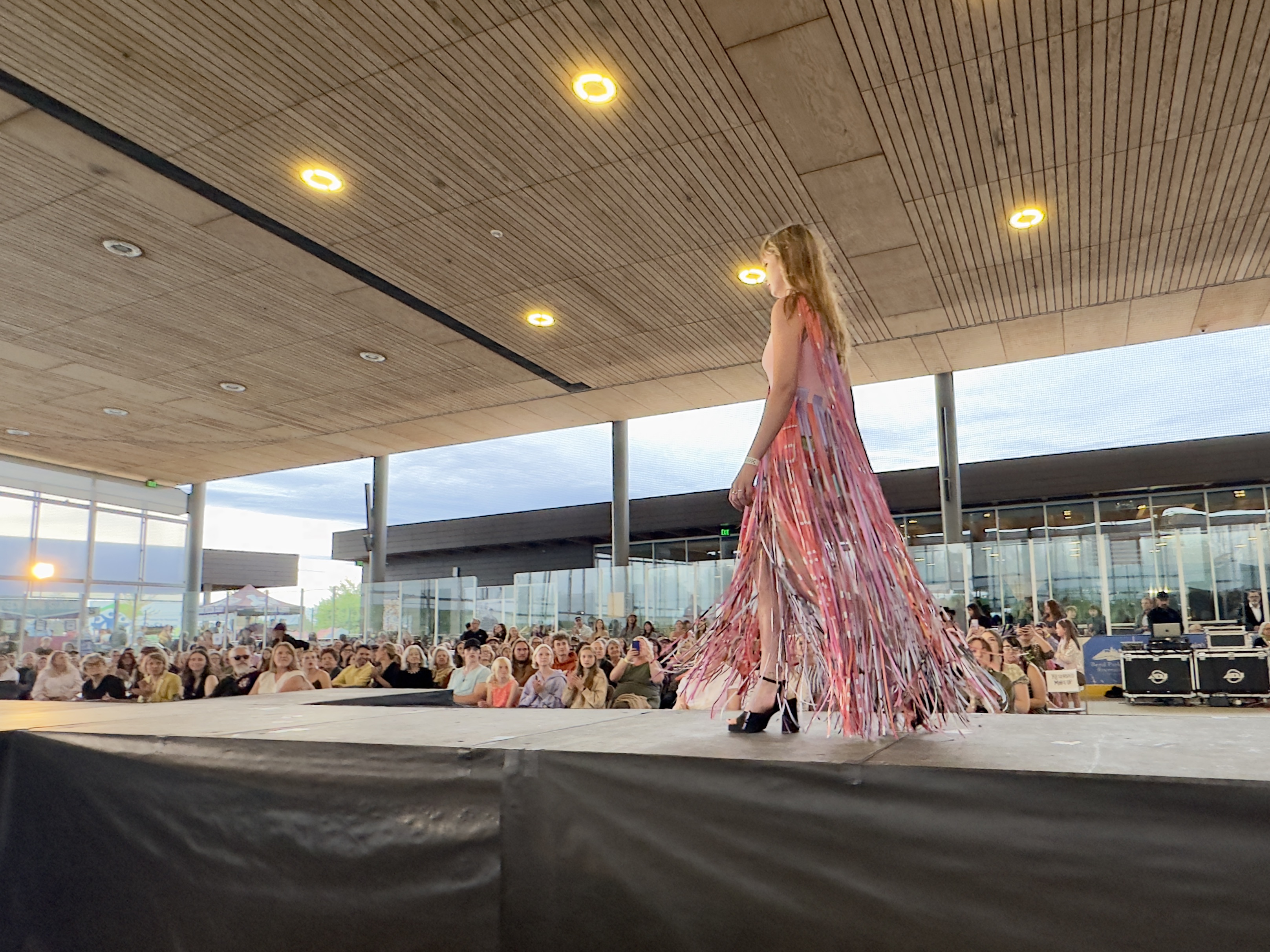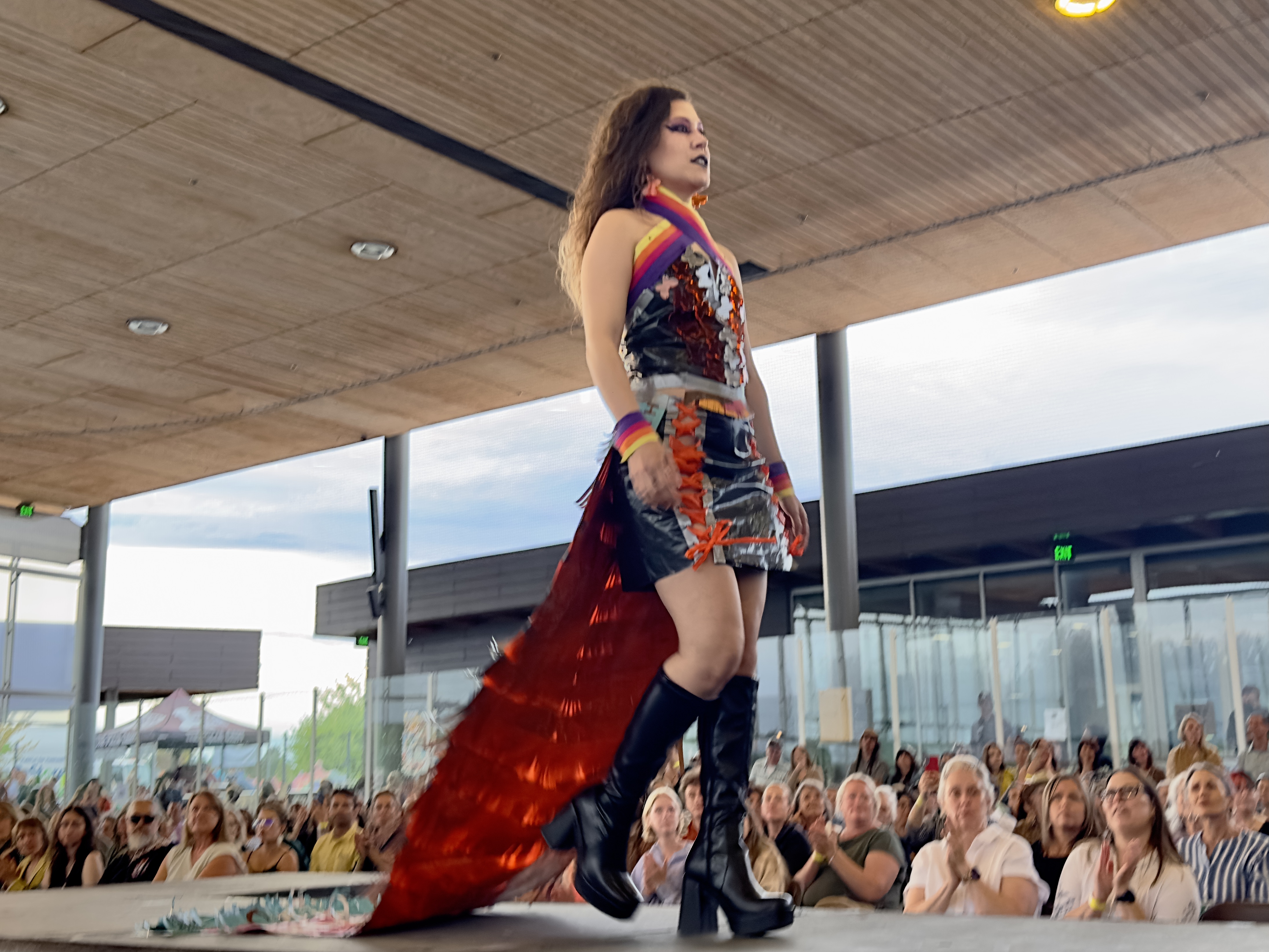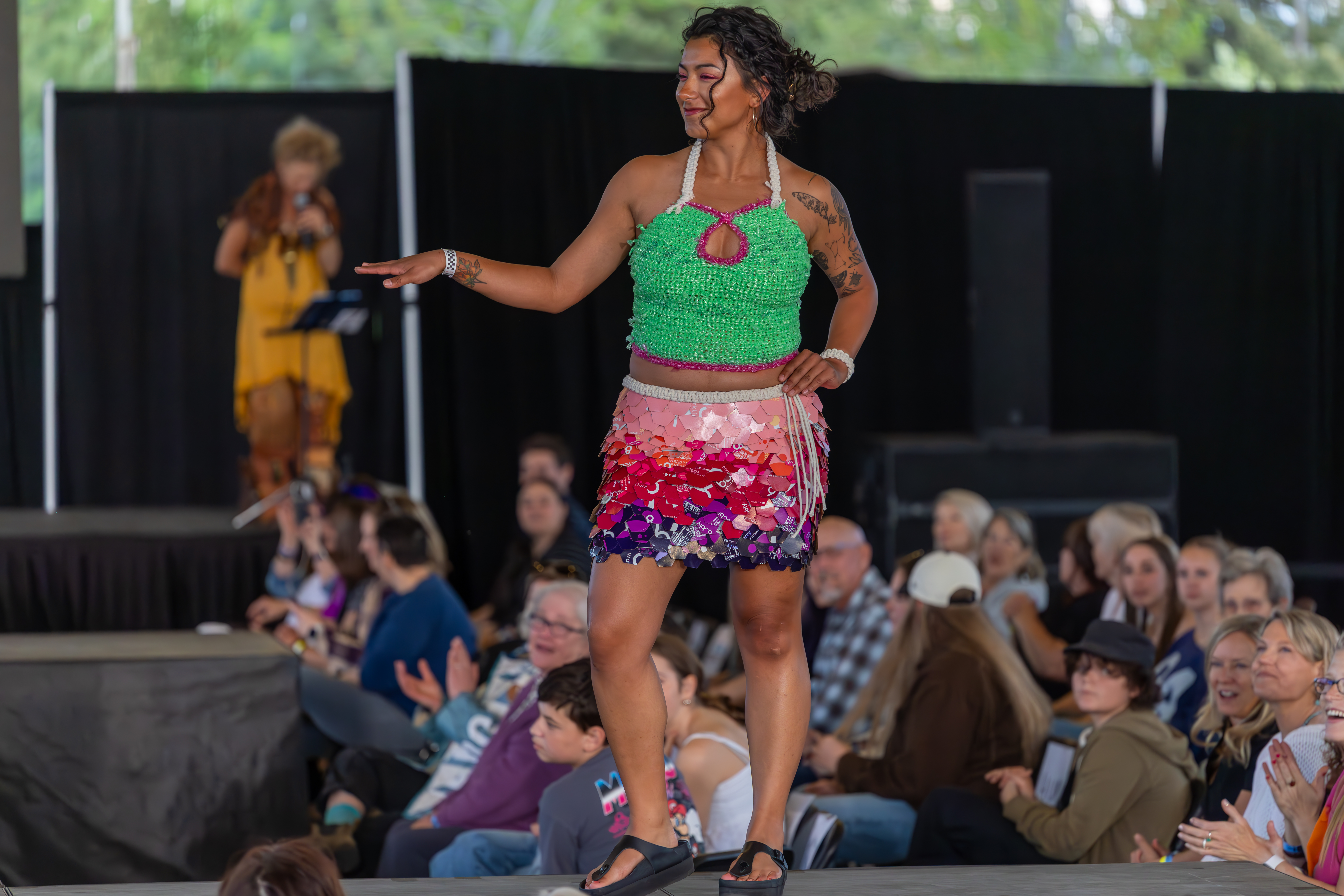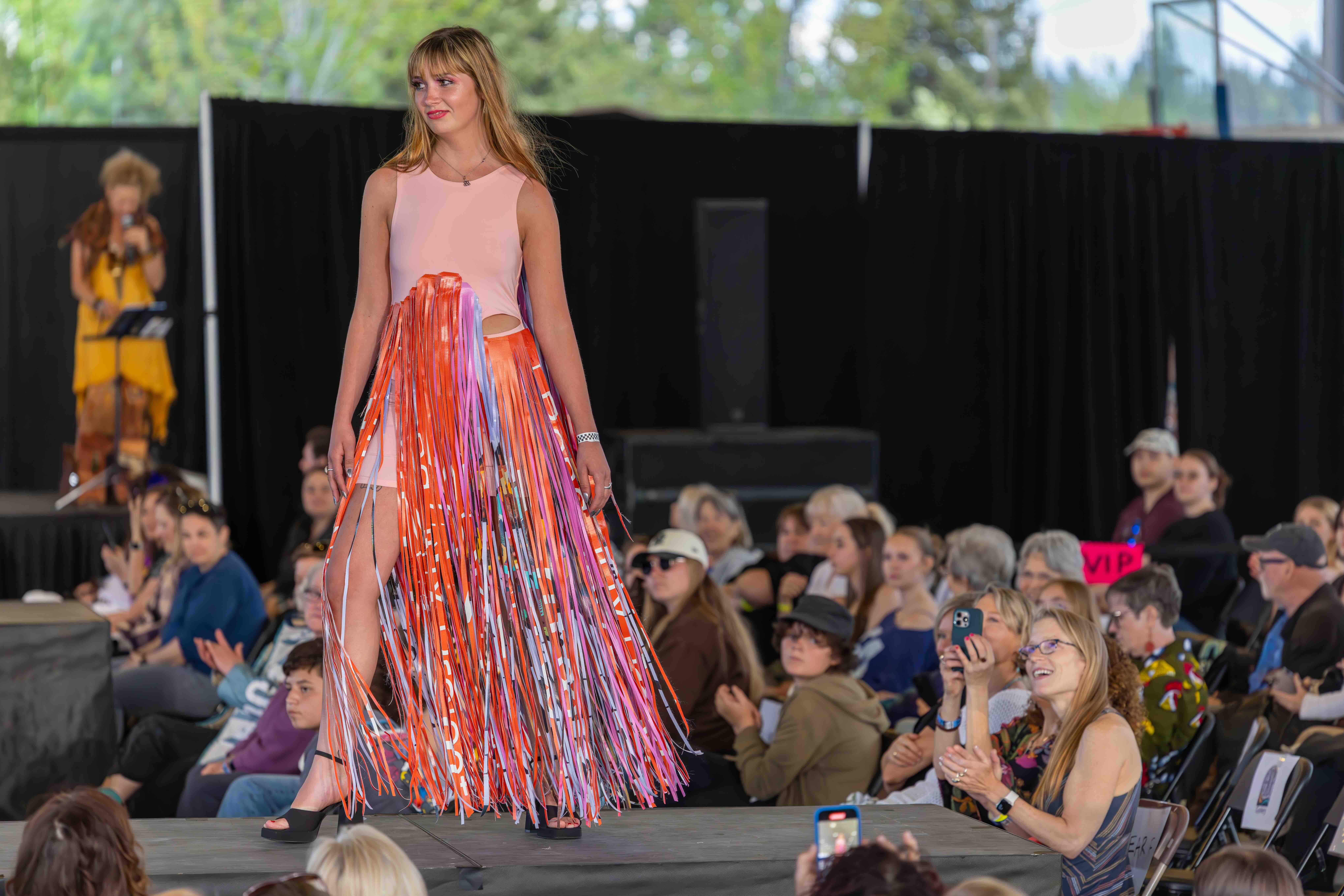 Designers: Nicole Potter Model: Bella Powers Materials: Plastic marketing signs and up cycled/discarded clothes and garment items Garment Description: Even without voices of their own, clothes can say so much. Instead of chanting “new new new” and “more more more,” let them scream that Old is the New Black! United on the right side of history, we’re all making it today with creativity, joy, and sustainable revolution because actually, we really DO care! I believe that art and fashion are windows and mirrors into our society and this moment inspires me to make my message louder. This garment has a lot to say about consumerism, power, and how we can all do more even simply by what we choose to dress in each day. Sustainable Practices: We divert, upcycle, and connect waste destined for the landfill to those who need, want, or use the waste.
