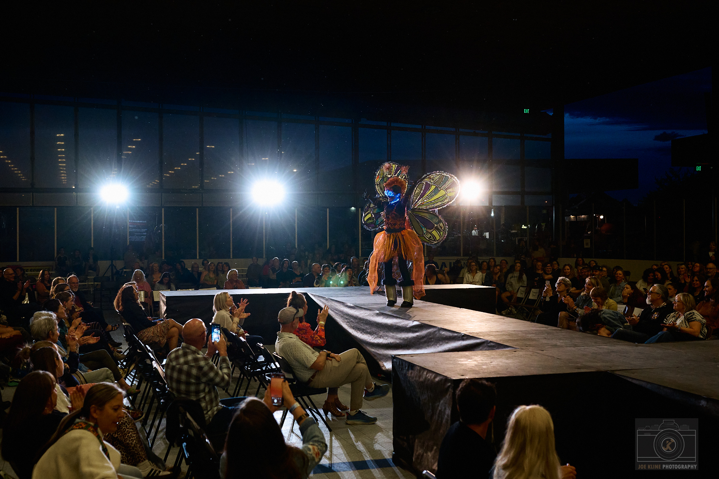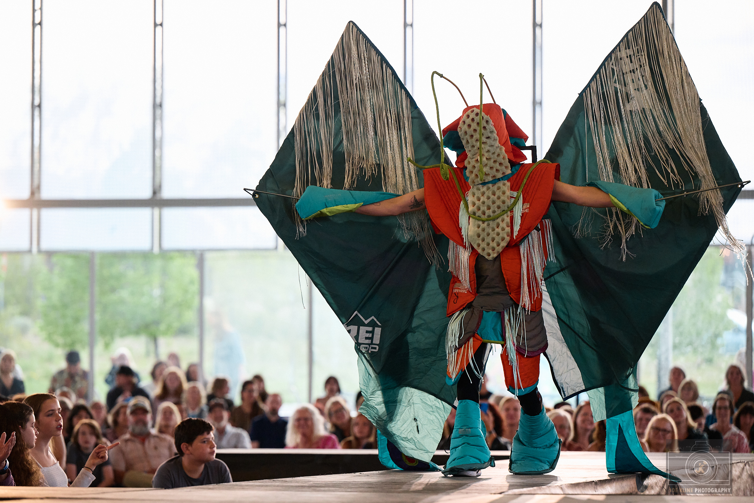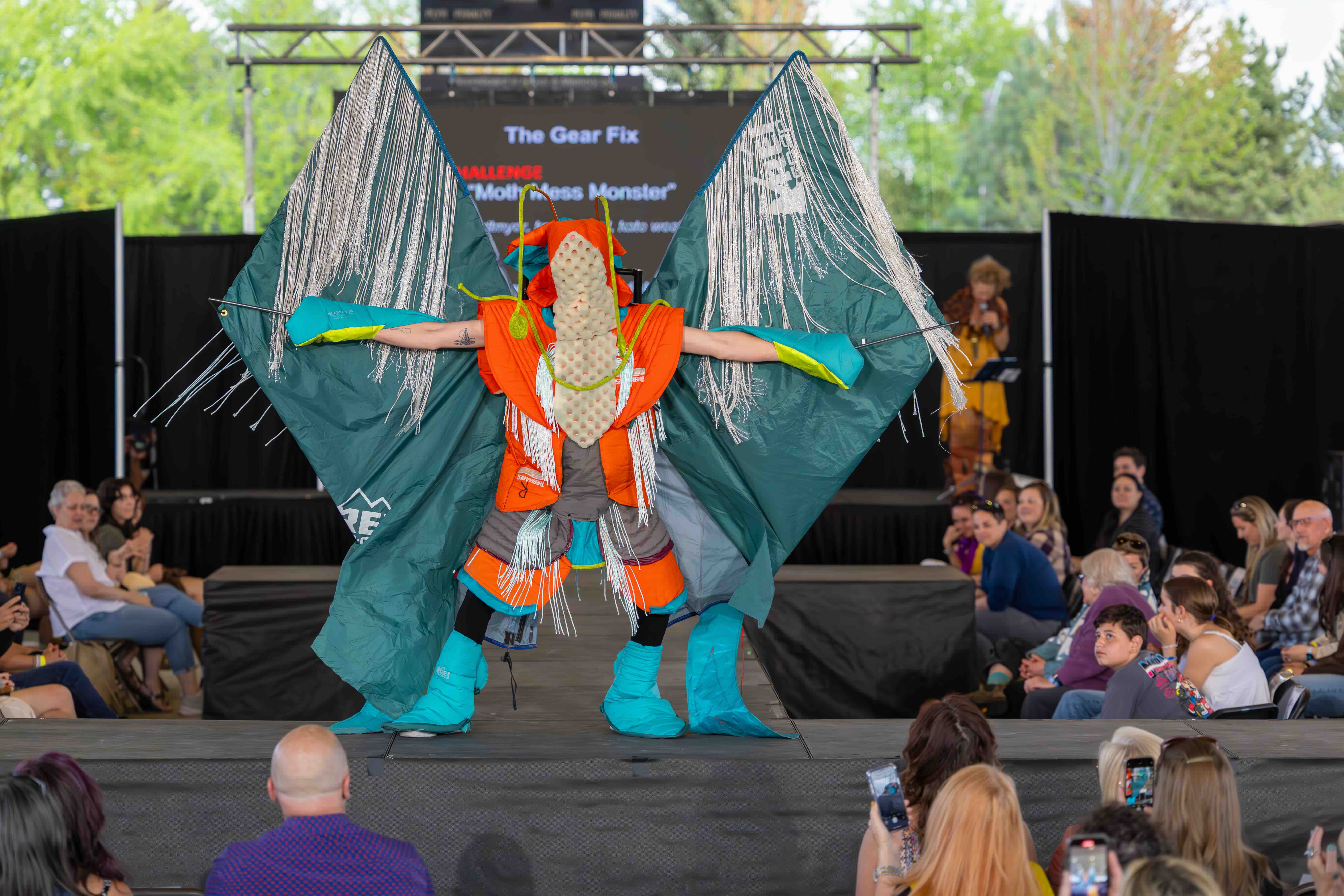 Designers: nico brilmyer, kasey boyd, kate weatherholtz Model: Bill Arnot Materials: a moth like suit made from old sleeping pads, tents, jackets, climbing rope and tent poles Garment Description: A cosmic guardian of the wild, the moss mess monster fights pollution across the stars clad in a battle-garb made from discarded camping gear. Glowing with the spirit of lost wilderness, he appears where ecosystems are under siege—silently gliding in on upcycled wings to confront the litterlords and smog barons. His message is clear: the things we leave behind can still protect what matters Sustainable Practices: By selling clothing on consignment, we decrease the initial investment of getting outside, and through repairing damaged gear, we help people recreate while keeping materials out of the landfill. These platforms allow us to promote and highlight companies that are doing their part in making quality gear that lasts, which in turn reduces their overall environmental impact.