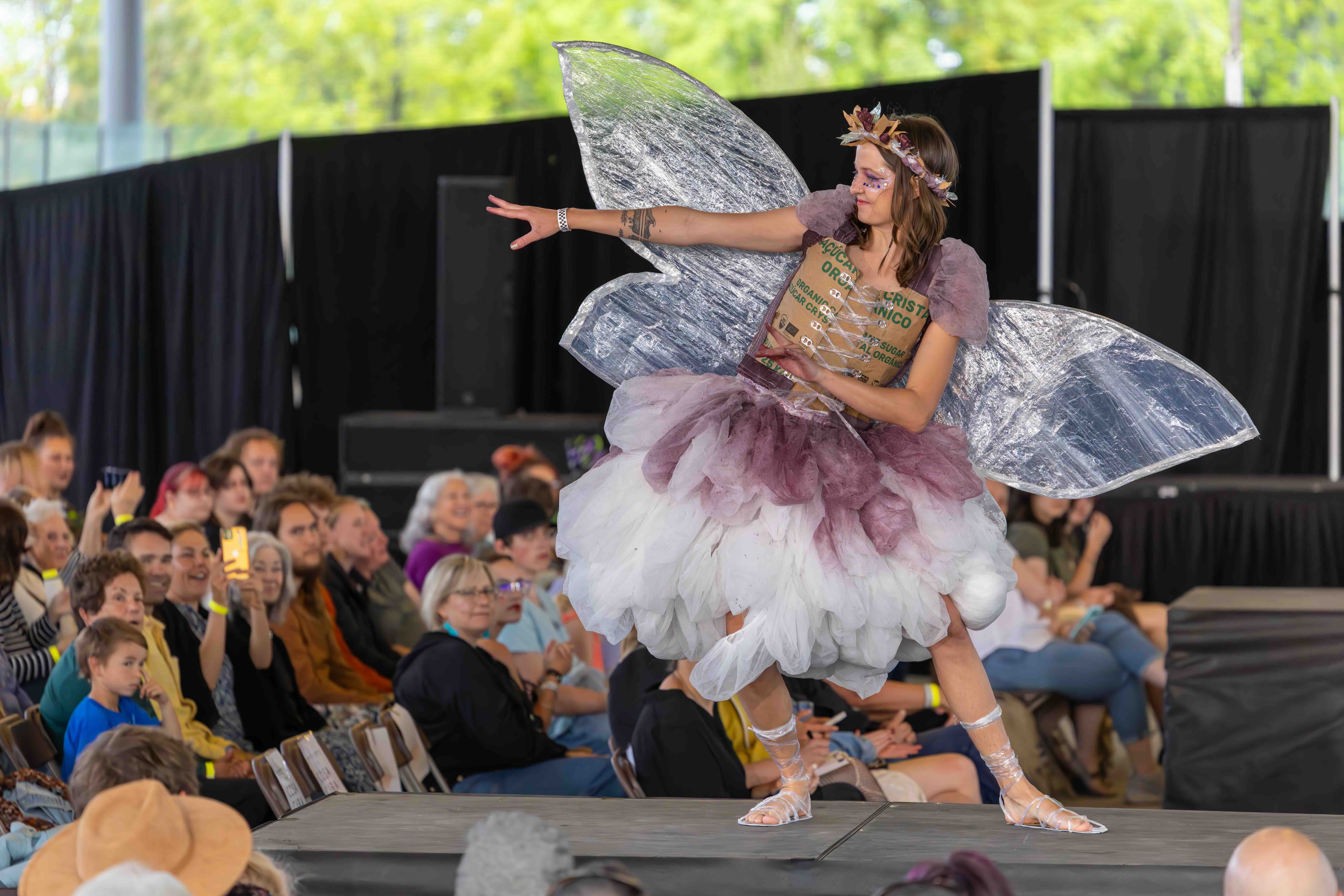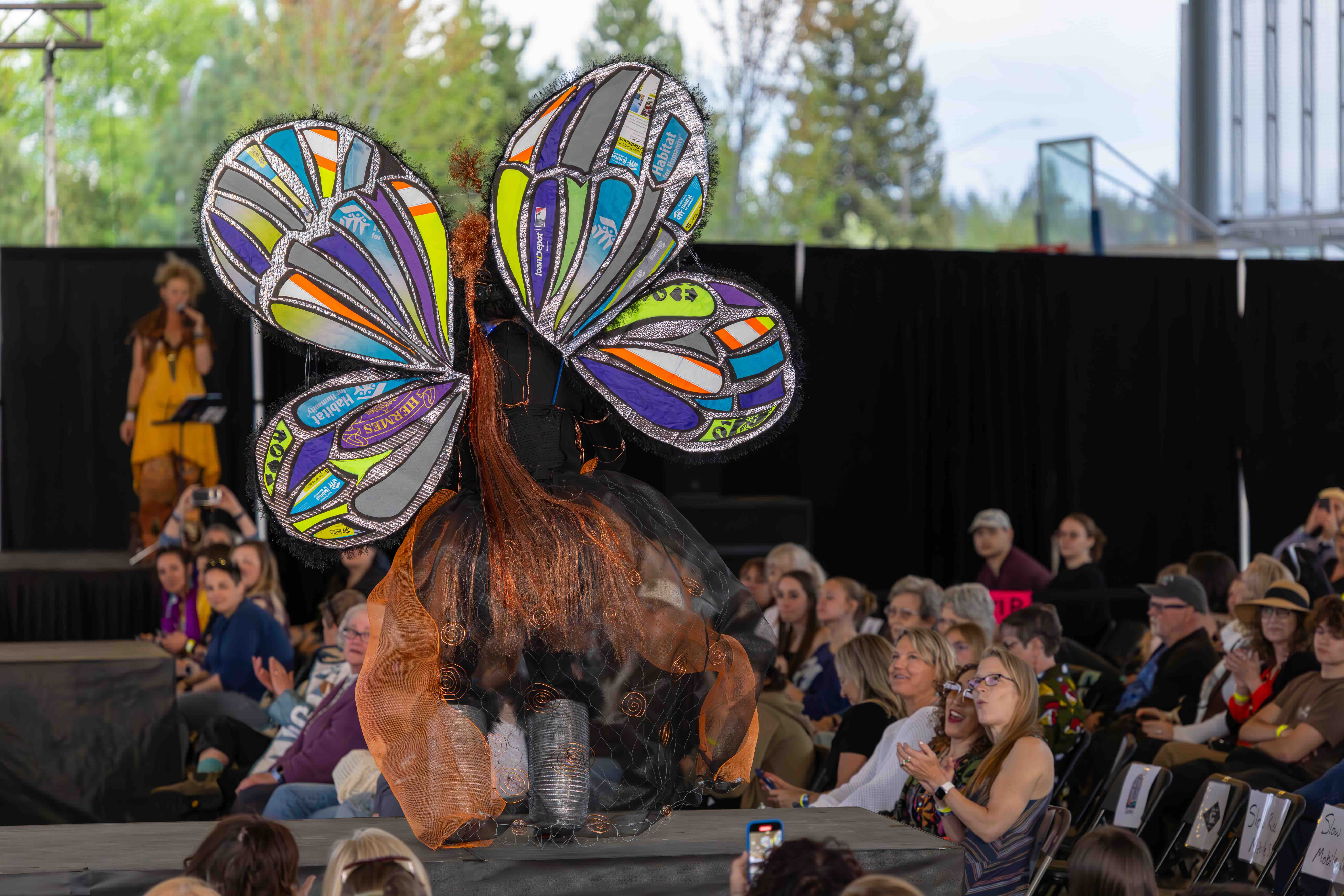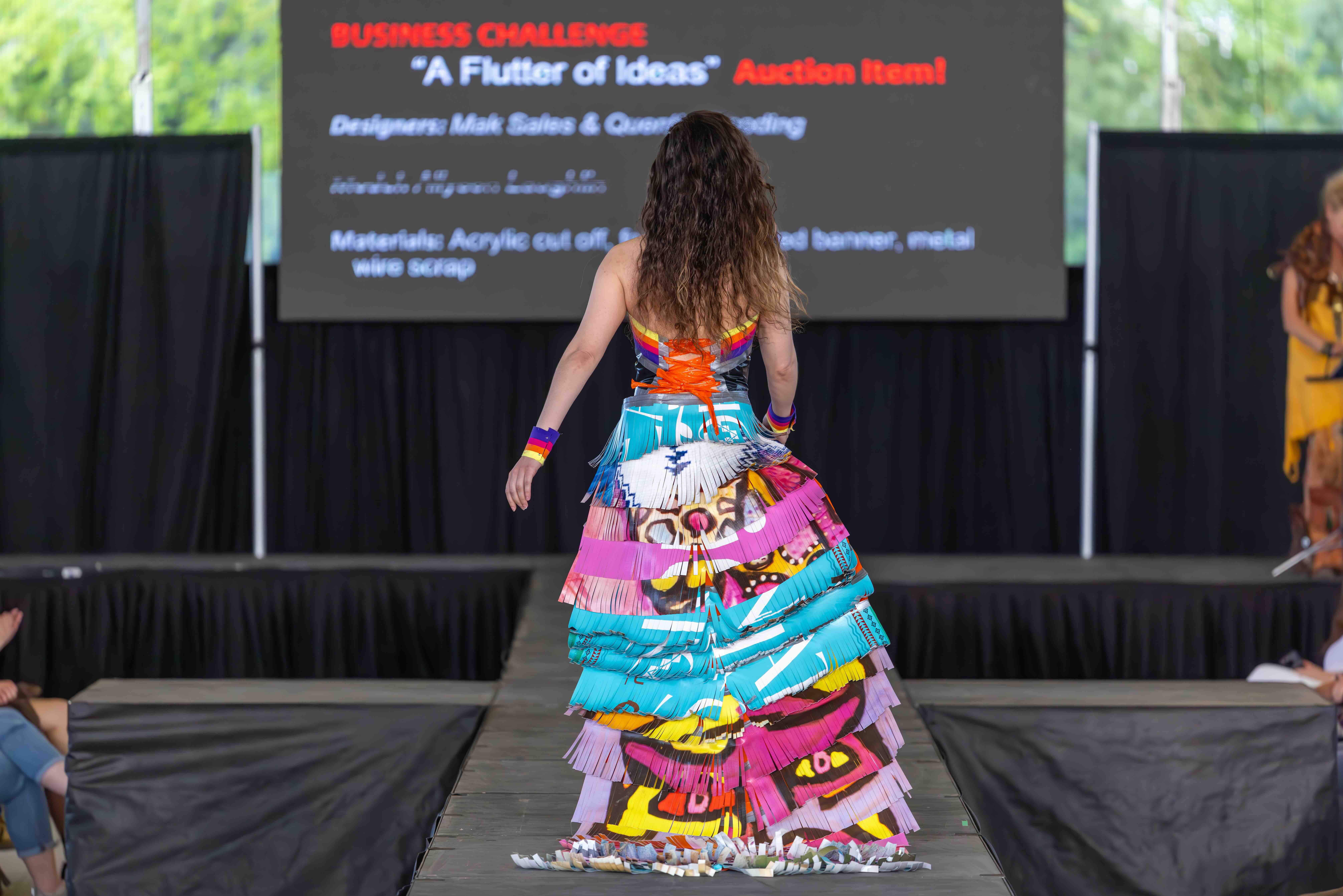 Designers: Mak Sales & Quentin Gooding Model: Allyson Laughlin Materials: Acrylic cut off, foam, discarded banner, metal wire scrap Garment Description: There’s less waste at the maker’s space! Those who enjoy being creative always find a use for other people’s scraps. We flutter idea to idea, similar to butterflies flying flower to flower. Our outfit is inspired by our deep appreciation for pollinators, while also embodying an array of acrylic cutoff butterflies, foam and plastics from tool packaging, and an old shower curtain and ripped hammock. Sustainability Practices: Since we are a space that incorporates so many different trades, we gather most of our materials through recycling, scrap and keep and reuse the majority of our waste.