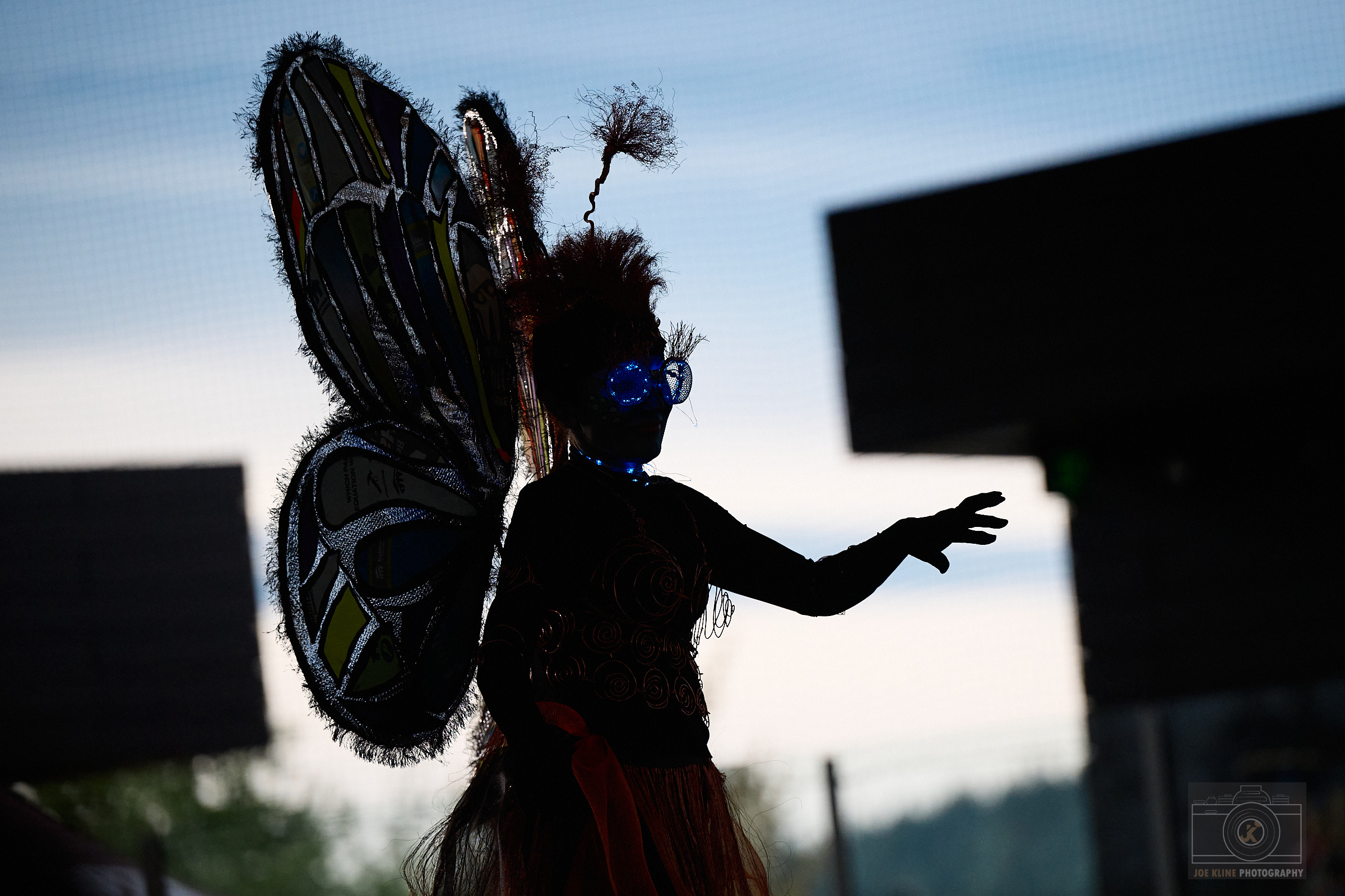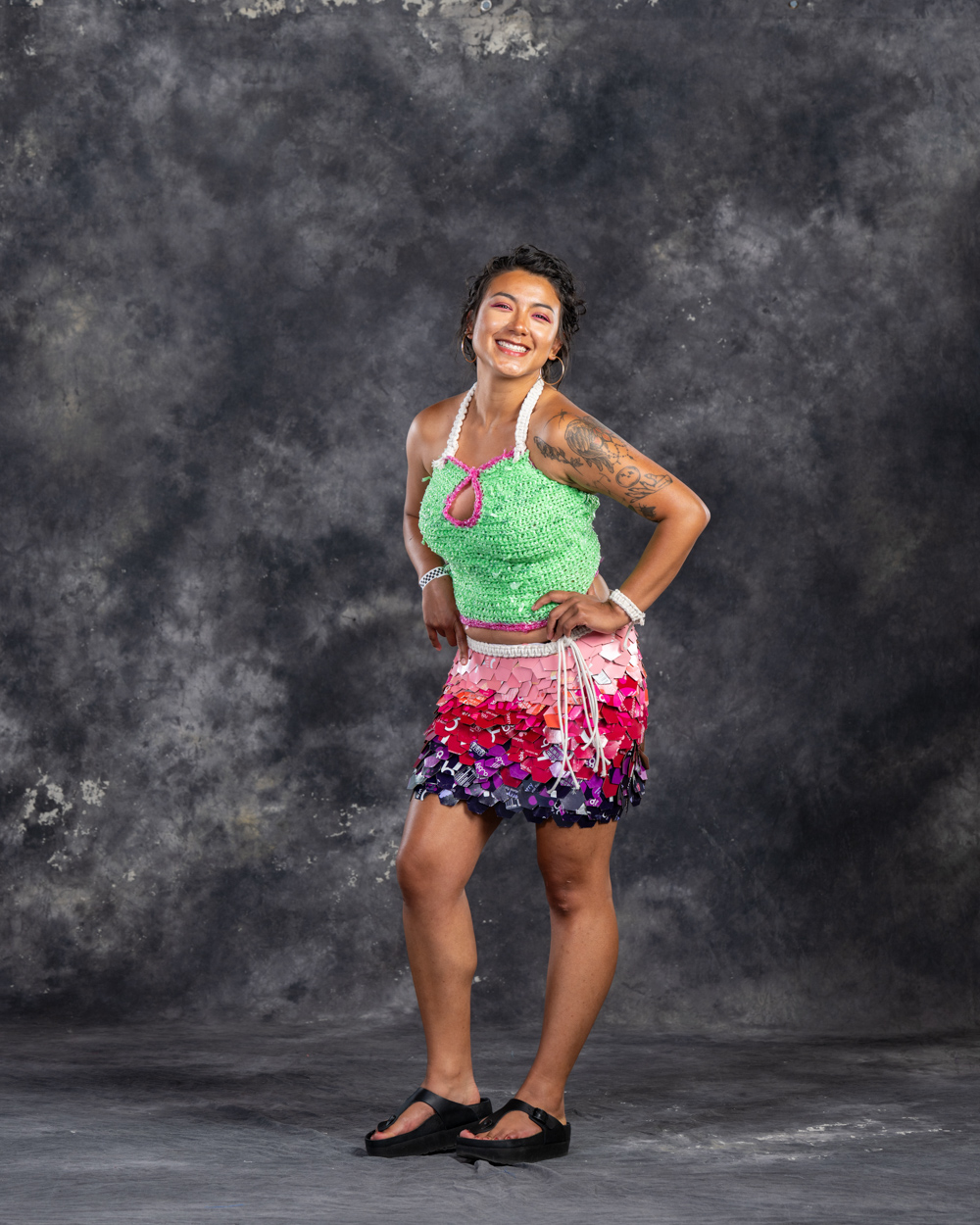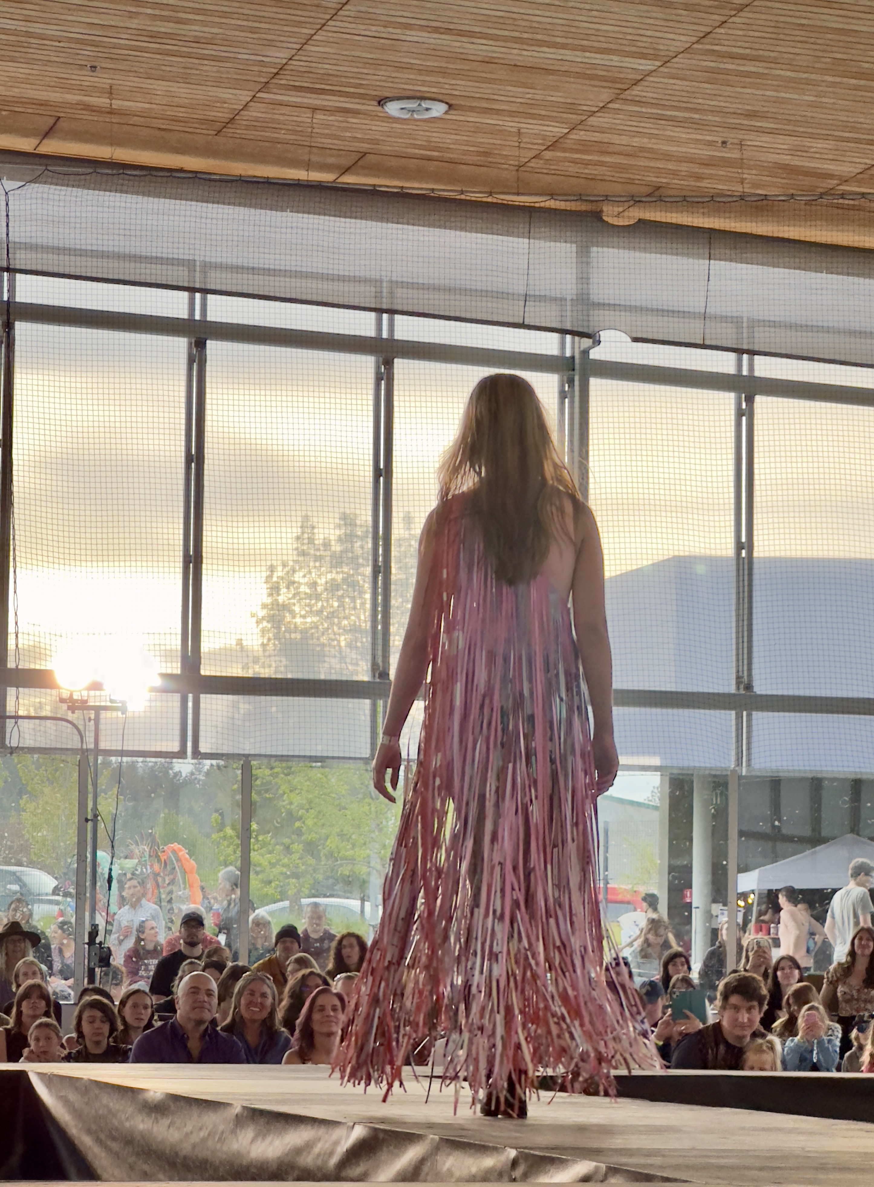Designers: Mak Sales & Quentin Gooding Model: Allyson Laughlin Materials: Acrylic cut off, foam, discarded banner, metal wire scrap Garment Description: There’s less waste at the maker’s space! Those who enjoy being creative always find a use for other people’s scraps. We flutter idea to idea, similar to butterflies flying flower to flower. Our outfit is inspired by our deep appreciation for pollinators, while also embodying an array of acrylic cutoff butterflies, foam and plastics from tool packaging, and an old shower curtain and ripped hammock. Sustainability Practices: Since we are a space that incorporates so many different trades, we gather most of our materials through recycling, scrap and keep and reuse the majority of our waste.