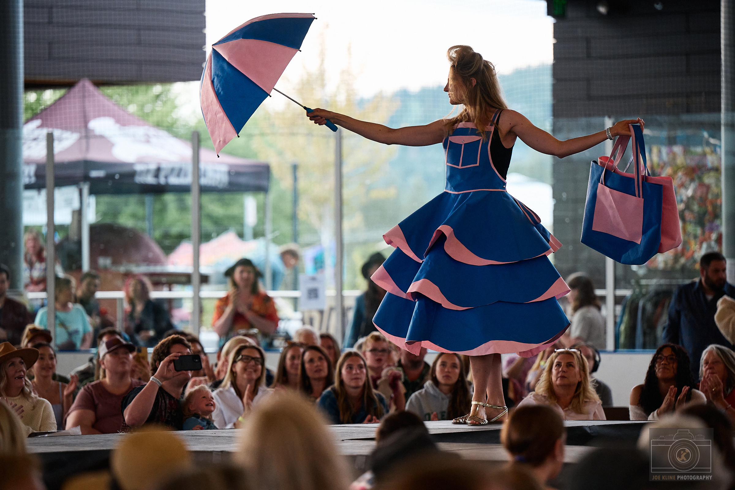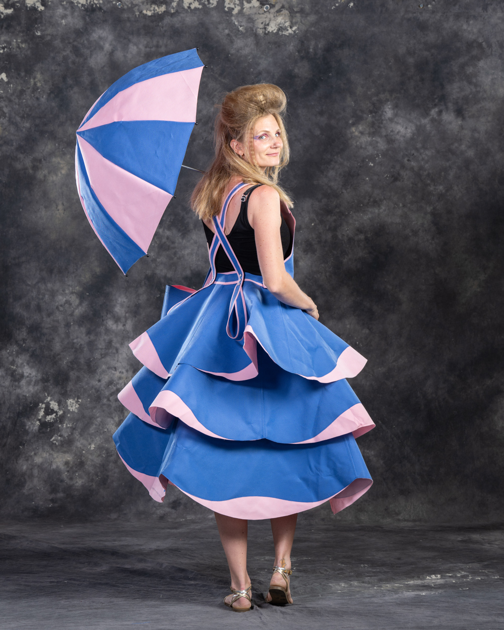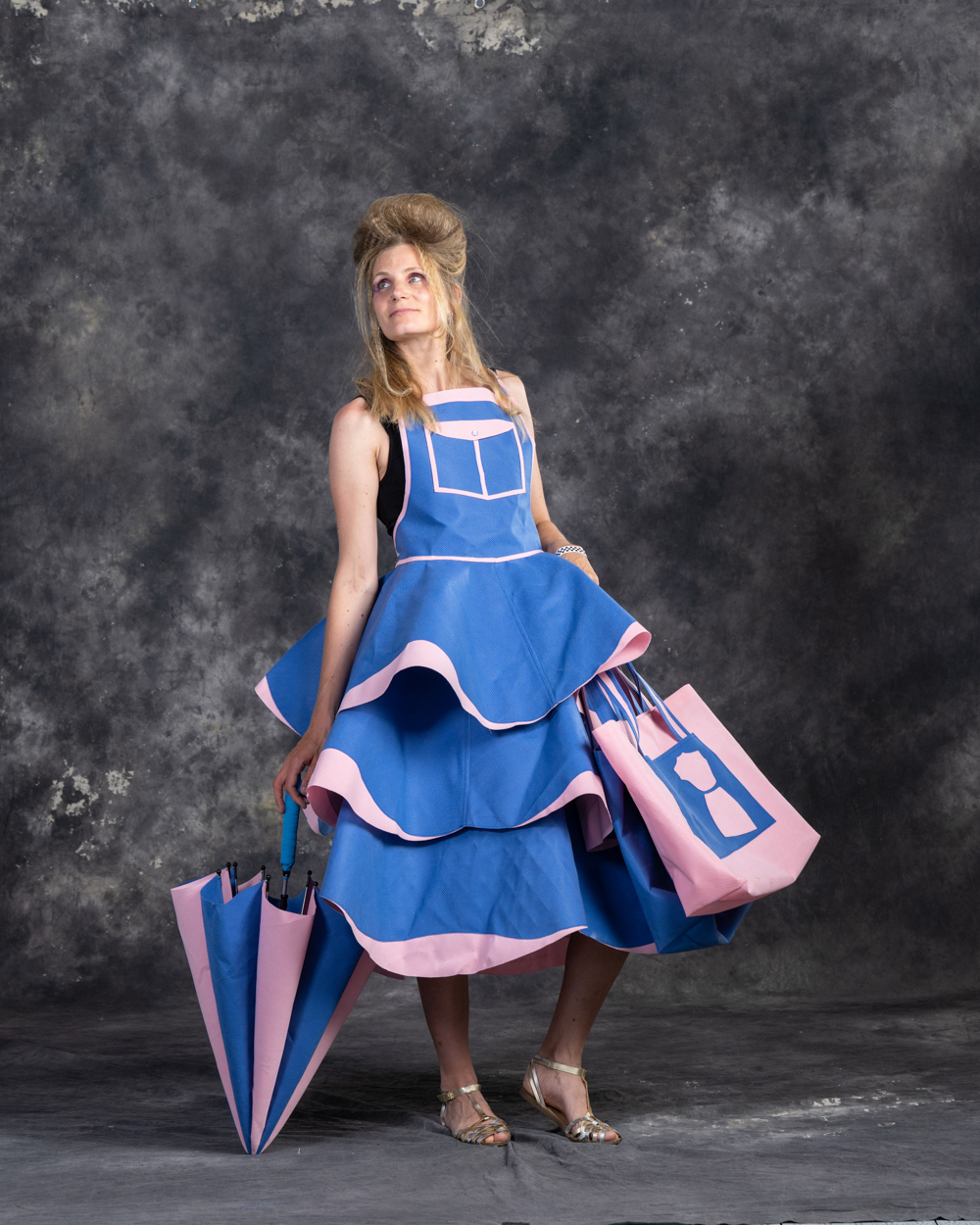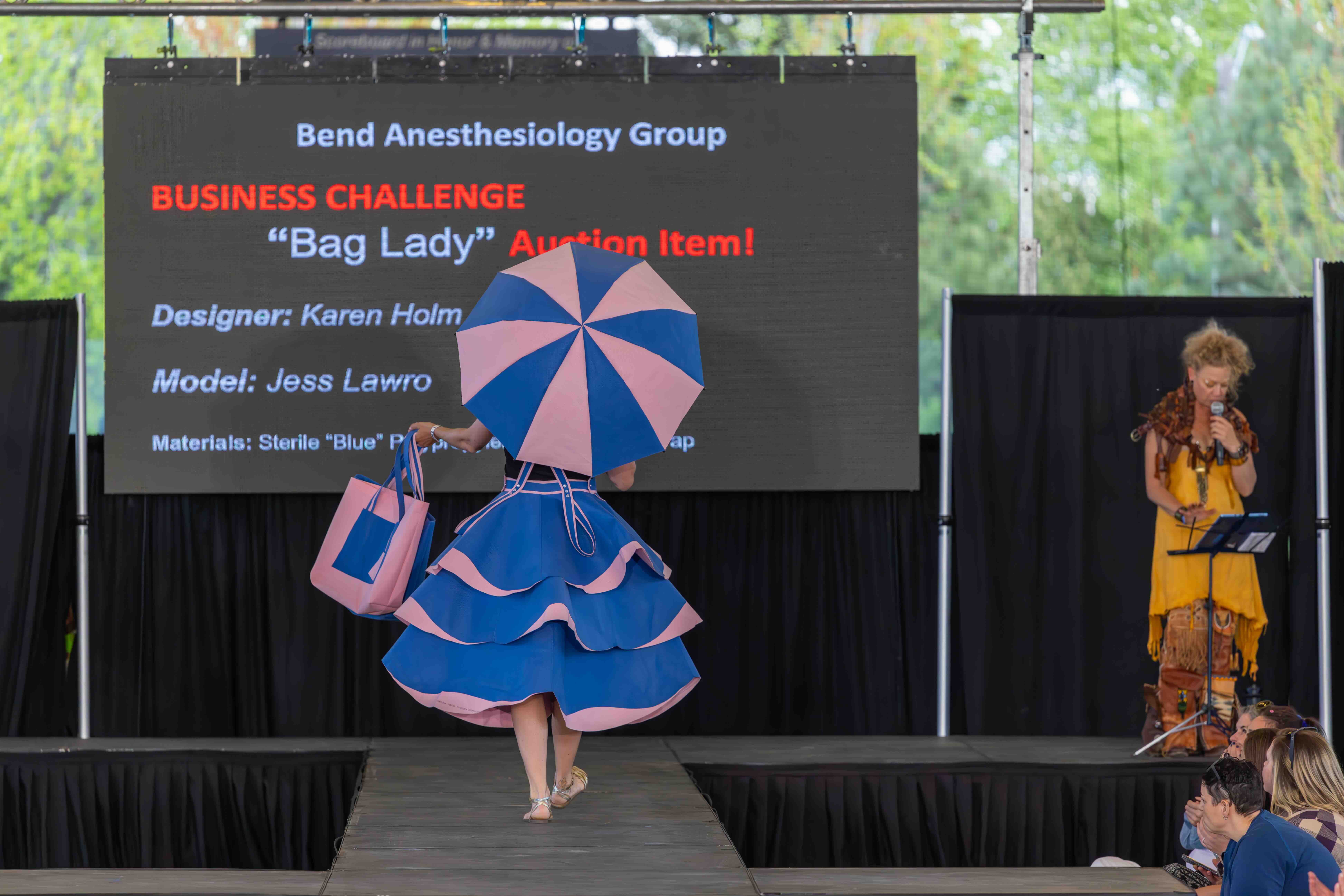 Designer: Karen Holm Model: Jess Lawro Materials: Sterile “Blue” Polypropylene (#5 plastic) wrap from OR supplies, discarded umbrella skeleton Garment Description: Bag Lady is not just a sustainable fantasy, but a testament to the transformation of discarded waste. Bend Anesthesiology Group is actively championing a change to the medical waste stream. One action is using poly wrap, destined for the landfill, to create tote bags for new families leaving the Family Birthing Center. Bag Lady, fashioned by prolific Rubbish renewed designer Karen Holm, highlights the simple, clean, beauty our future could hold by lessening our impact on the planet. Sustainable Practices: As an anesthesia group, BAG is committed to enhancing environmental stewardship and sustainability. Practices include recycling plastic wrap from surgical instruments, reducing our use of anesthetic gases—particularly desflurane—and initiating efforts to collect and send unused medical supplies to Ukraine.